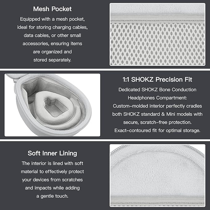 - 【Mesh Pocket for Accessories & Smart Interior Layout】Inside the case, a mesh pocket helps organize cables, earplugs, and small accessories for your After OpenMove or OpenRun Pro. The custom-molded insert snugly cradles both OpenRun Pro wireless and audifonos OpenRun Pro Mini, ensuring a scratch-free and clutter-free interior. Whether you're heading to the gym, the pool, or work, this case keeps your after bone conduction headphones and gear tidy and protected.