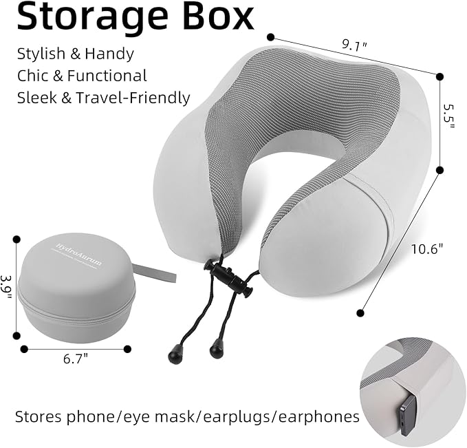 - Must-Have Neck Pillow Airplane Essential with Storage Every HydroAurum pillow comes with a breathable, machine-washable cover and a compact storage bag — the perfect travel essential for clean and effortless comfort.