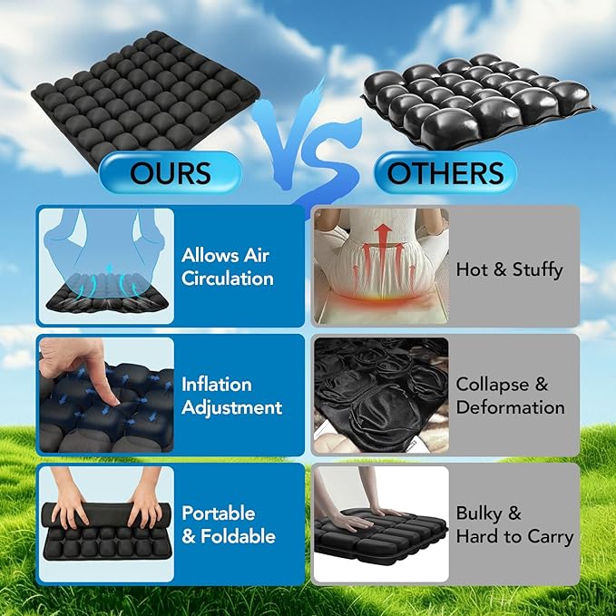 - Ultra-Portable & Travel-Ready: The 3D air inflatable pressure relief cushion weighs just 0.7 lbs and folds to water-bottle size. Easy storage in bags, backpacks, or luggage—TSA-approved for pain-free flights and road trips.