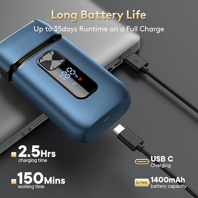 - Up to 150 Min Runtime & Smart Digital Display & USB C Fast Charging: The led power level indicator exactly shows the amount of time left on the 18650 lithium ion battery without worrying about it running out mid-shave. mens electric shavers for face allows for 150 mins of continuous run time on a single 1.5 hrs charge.