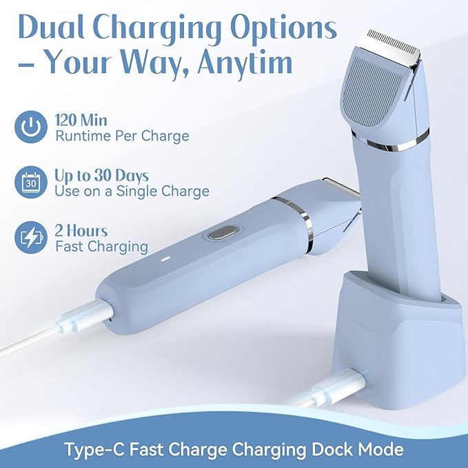- ⥠USB-C Fast Charging & Convenient Dock: This electric razor for women features a modern USB-C fast charging system and a convenient charging dock. A full 2-hour charge delivers up to 90 minutes of continuous use, making it perfect for home grooming or travel touch-ups. Forget battery hassles â stay ready anywhere.