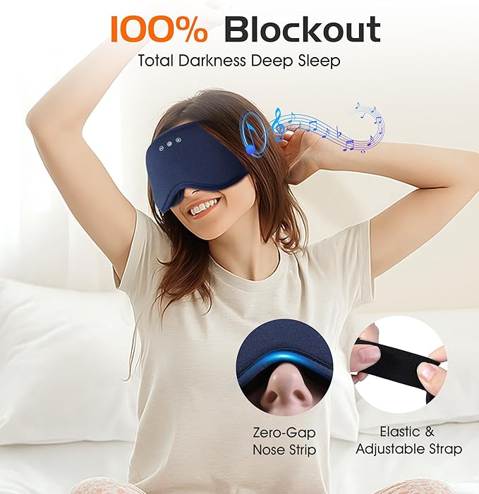 - 【Perfect 100% Light Blocking】:The unique design of our sleeping headphones bluetooth fitted around the nose brings you a complete dark sleep environment. Even in bright places, you can be at ease for a nap or for the night by wearing the headphones for sleeping. Get the benefits of total blackout, whether at home, in a hotel or on the plane, light blockout anywhere, anytime.With an adjustable strap