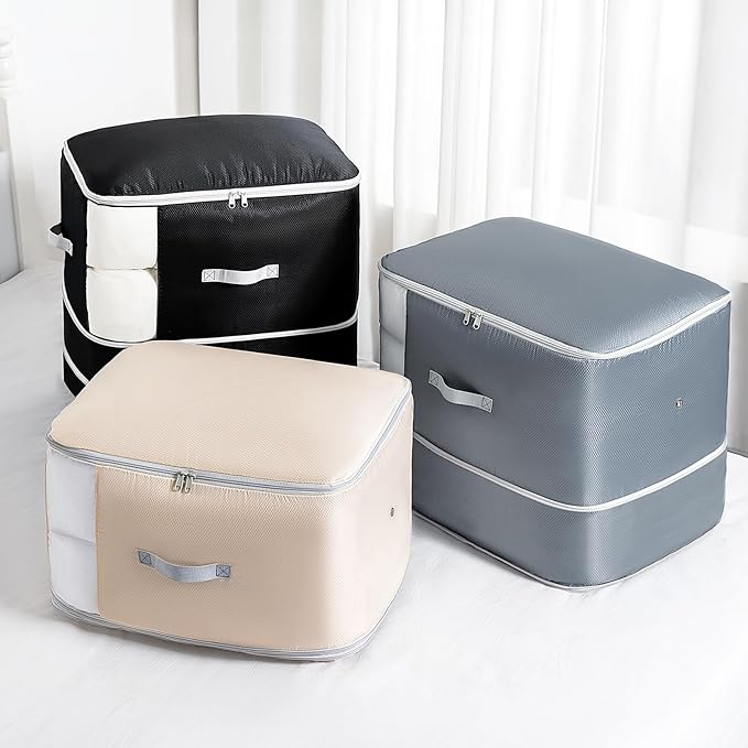- [Dual Reinforced Handles for Easy Access] Equipped with two strategically placed handles—one on the front and one on the side—our blanket storage bag allows you to easily pull it out whether it's stored horizontally or vertically. The reinforced stitching of the whole bag ensures sturdy support, making it effortless to move or reorganize even when the comforter storage bag is fully packed