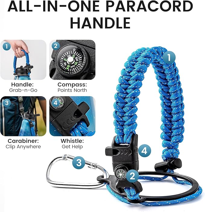 - Adventure Ready Paracord Handle: RAYMYLO 1/3 gallon water jug features a stylish color-coordinated paracord handle with a built-in compass and carabiner clip. This reusable water bottle's paracord handle is lightweight, durable, and perfect for hands-free carrying during hikes, cycling, or camping. Grab & go for spontaneous adventures under the stars!