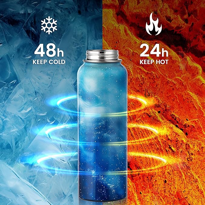 - 48H Cold & 24H Hot Triple Insulation: RAYMYLO 64 oz Insulated Water Bottle's copper-plated triple-wall vacuum design keeps drinks icy cold for 48hrs and warm for 24hrs. This Aurora Starry Sky stainless steel water bottle is designed for efficient hydration. 1/3 gallon water bottle keep icy-cold drinks at your fingertips!
