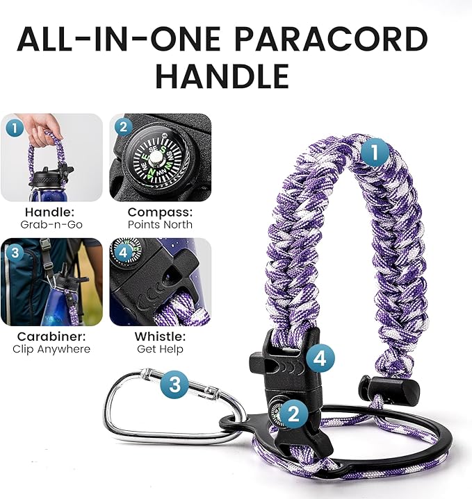 - Adventure Ready Paracord Handle: RAYMYLO 1/4 gallon water jug features a stylish color-coordinated paracord handle with a built-in compass and carabiner clip. This reusable water bottle's paracord handle is lightweight, durable, and perfect for hands-free carrying during hikes, cycling, or camping. Grab & go for spontaneous adventures under the stars!