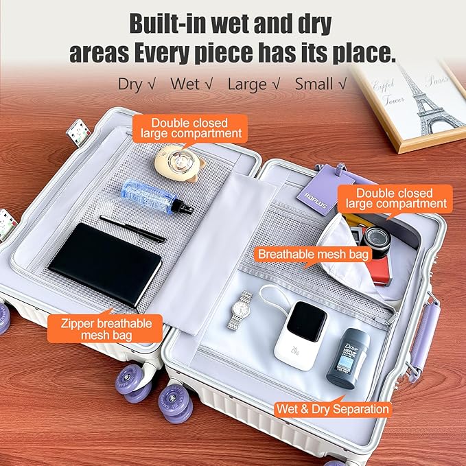 - LARGE STORAGE SPACE: Storage is the strength of this luggage. This aluminum framed suitcase has a large interior storage space with wet and dry compartments and two oversized zippered compartments for your laptop and more