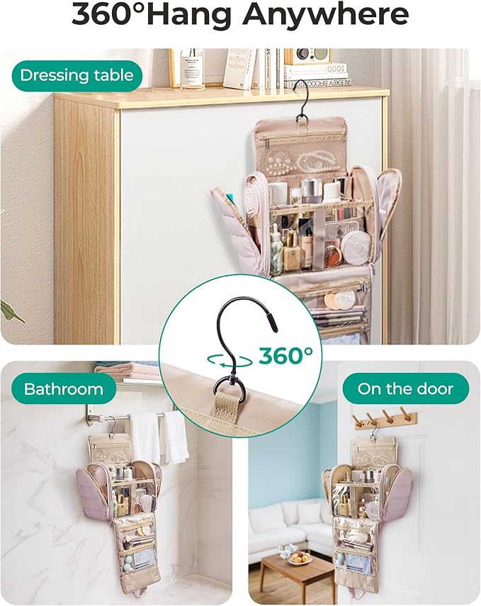 - Effortless Visibility & Access: Wide-opening design + transparent zippered pockets provide clear visibility and easy access to your items. Features smooth-gliding dual metal zippersand a 360° swivel hook—hang anywhere (towel racks, doors, hooks) to free up counter space