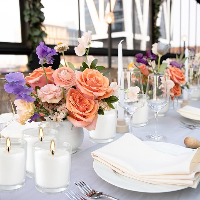- 【48-Pack Elegant White Candles】 This set includes 48 clean-burning white candles in sleek glass cups, perfect for weddings, home decor, outdoor party decor, restaurants, romantic ambiance, DIY decorations, birthdays and many other uses. It is also perfect for emergency use during power outages.