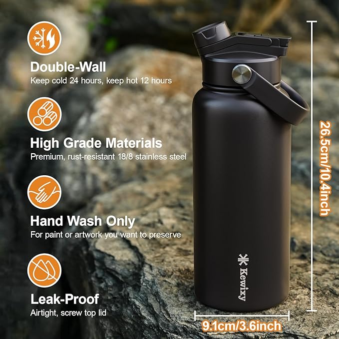 32 oz Insulated Water Bottle, 2-in-1 Lid, Straw & Spout with Protected, Leak Proof, Keep Cold, Stainless Steel, Metal, Reusable, Handle, for Outdoor, Gym and School, 2 Lids, Midnight Black
