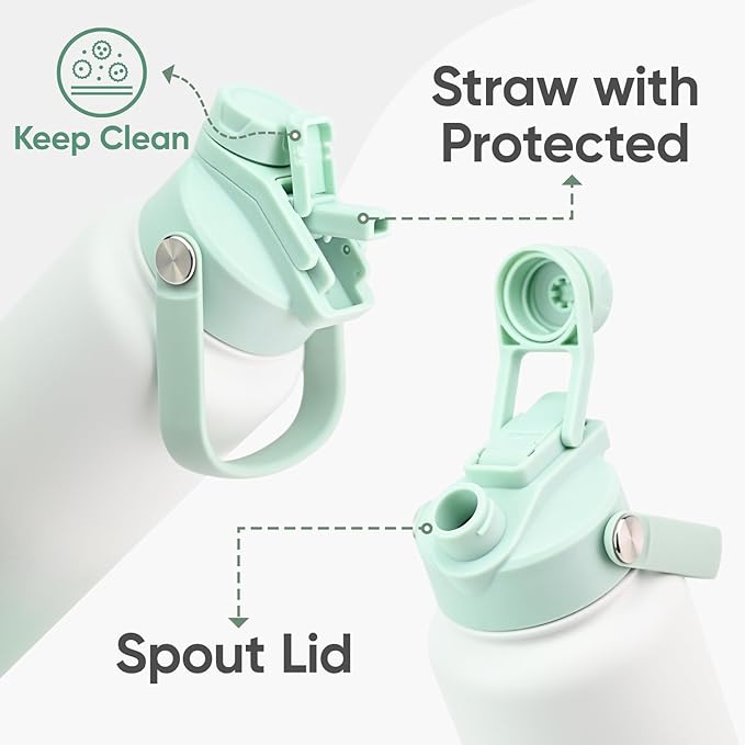 32 oz Insulated Water Bottle, 2-in-1 Lid, Straw & Spout with Protected, Leak Proof, Keep Cold, Stainless Steel, Metal, Reusable, Handle, for Outdoor, Gym and School, 2 Lids, Iced Mint
