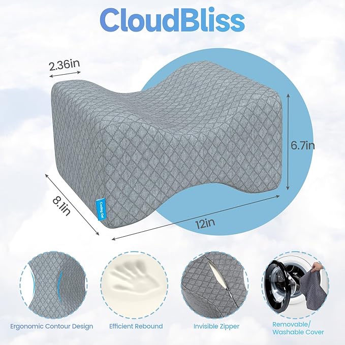 CloudBliss Knee Pillow for Side Sleepers - Cooling Leg Pillow for Side Sleeping, Memory Foam Knee Pillow for Hip Pain, Lower Back Pain, Sciatica Pain, Knee Wedge Pillow with Contour Design,Grey