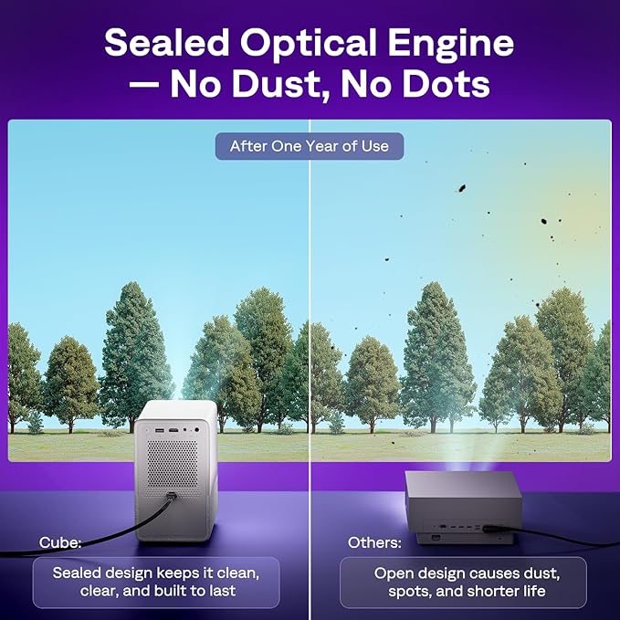 - Sealed Optical Engine | Stay Clean and Clear: The dust-proof sealed light engine maintains vivid color and sharp detail while sparing you routine cleaning dust spots. Library-quiet cooling and zero light leakage keep your viewing distraction-free.