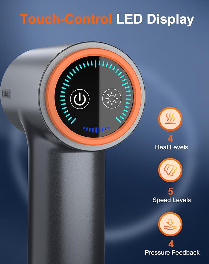 - Touch-Control LED Display: The massage tools feature an intuitive LED touch-control display, allowing you to easily adjust the 4 heat levels and 5 speed settings; This setup helps provide a customizable massage experience