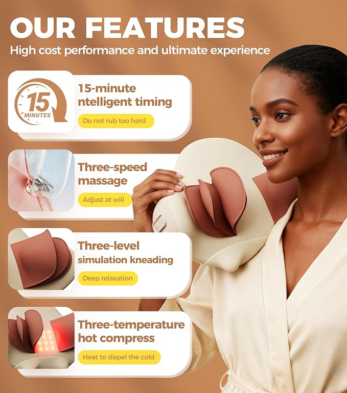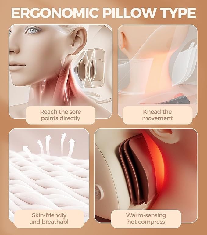 - Deep-Tissue Massage Modes Built-in massage nodes target tight neck muscles, mimicking real-hands kneading. Choose from gentle to intense—great for post-workout recovery or unwinding after a long day. Quiet motor means you can use it at home/office without distractions.