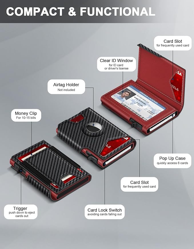 • QUICK CARD ACCESS: This leather wallets combines high-quality leather and premium metal, featuring a smooth pop-up mechanism. Simply press the side button on the metal wallet for men, all cards pop up at a step pattern that makes them very easy & convenient to take out.