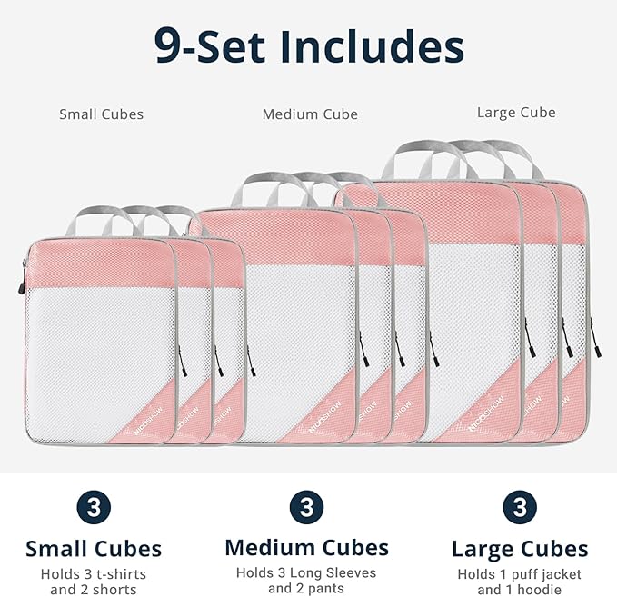 - What Will You Get: NICOSHOW 9-set compression packing cubes for travel include 3 small cubes (12''x8''x4''), 3 medium cubes (14''x10''x4''), 3 large cubes (16''x12''x4'')
