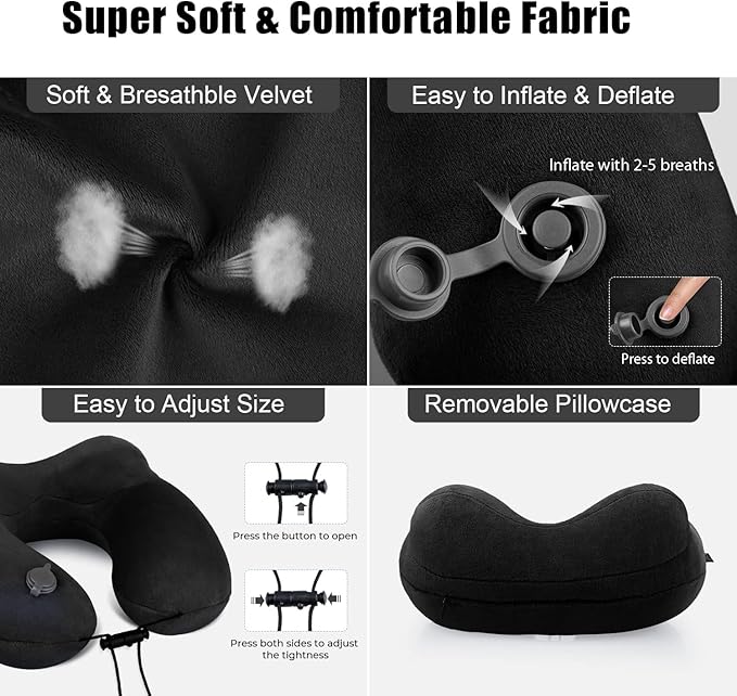 urophylla Inflatable Travel Neck Pillow for Airplanes, Super Soft Velvet Neck Support, Adjustable Firmness, Blow Up Plane Pillow for Long Flights, Road Trips, Travel Essentials with Eye Mask, Earplug
