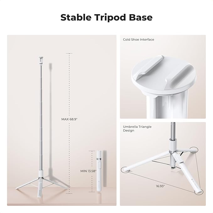 - Stable & Portable: This selfie stick tripod features an aluminum alloy tripod. When fully extended, the tripod spans 46.93 inches (43 cm), providing stable support. The height can be adjusted from 13.6 inches (34 cm) to 68.9 inches (175 cm), supporting wide-angle shooting. This selfie stick for Android is only 0.8lb(376g), which is easily fitting into a handbag, making it a perfect companion for outings, hiking or urban exploration.