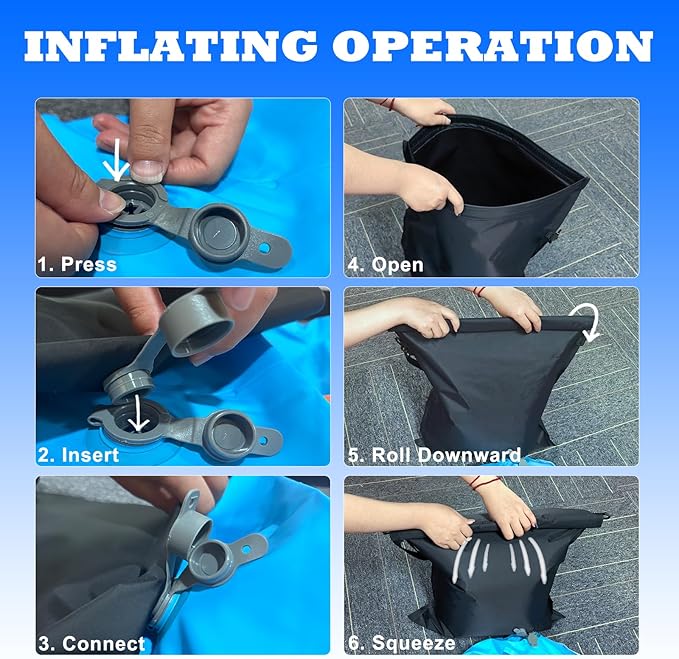 - 【3-In-1 Waterproof Black Bag】: Carry pouch & Inflatable bag (no electric pump needed) & water container in one. Spacious carry bag: 15 L water tank (≈33 lb) / gear storage, crossbody. When you're done, drop wet swimsuits and sandy toys into the roomy carry bag and sling it over your shoulder—hands-free, hassle-free