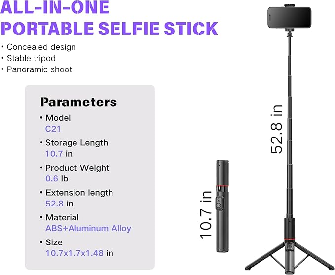 C21 53″ Travel Selfie Stick Tripod with Bluetooth 5.2 Remote – Hidden All-in-One Extendable Foldable Phone Tripod Stand for iPhone Android Vlogging TikTok YouTube Live Streaming