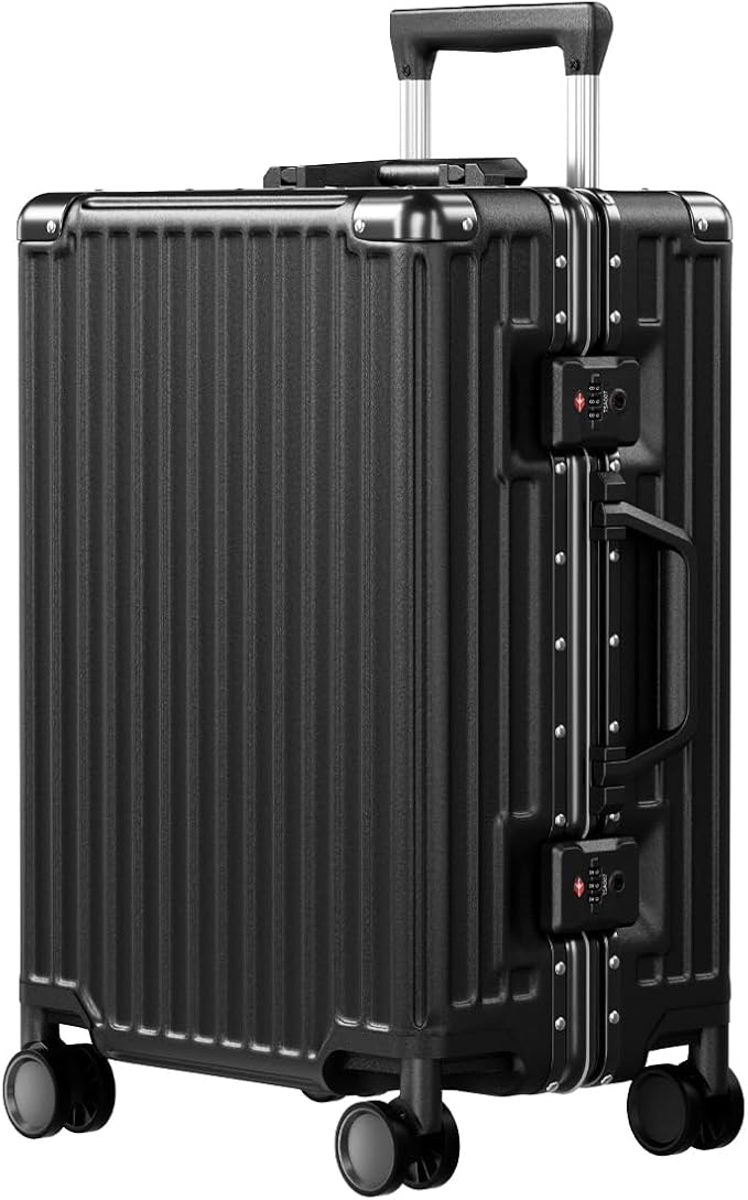 - Aluminium Carry On Luggage: Size: 15*9.1*21.3 IN, Weight: 7.24 LBS, Volume: 38 L. Made of PC and ABS material, lightweight. In addition, the outer frame and 4 corner protectors are made of 100% aluminium alloy material, sturdy and durable.