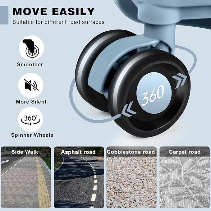 - Dual Spinner Wheels: The zipperless luggage is equipped with 4 dual silent spinner wheels, smooth and easy gliding. In addition, the 360° spinner wheels can be easily rotated in any direction, forward or backward, to ease your burden of movement.