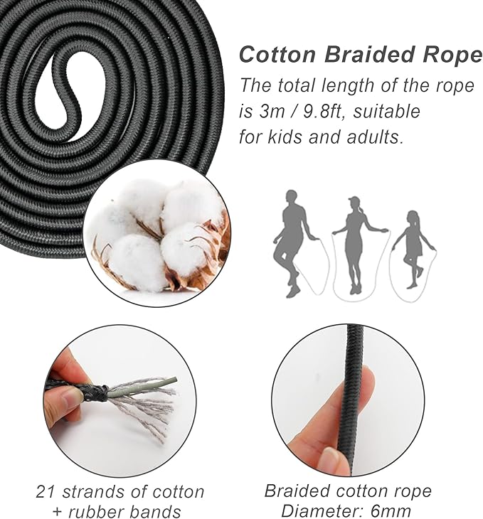 - Cotton Jump Rope: the rope of kids jump rope was made of soft cotton rope, not too light but not too heavy either, making it easy and comfortable for adults and children to use