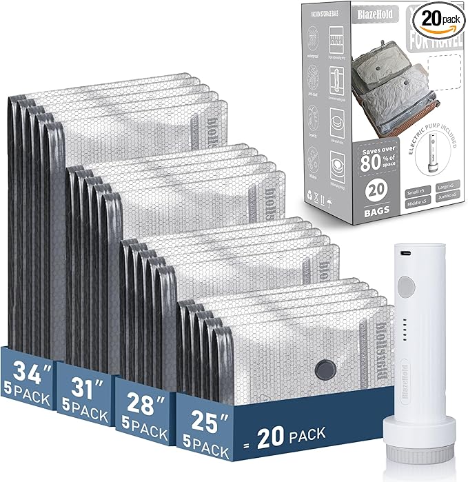 20 Pack Travel Vacuum Storage Bags with Rechargeable Electric Pump, Compression Packing Seal Bag for Luggage and Suitcase, 5 Small + 5 Medium + 5 Large + 5 Jumbo Space Saver Bags for Clothing Travel