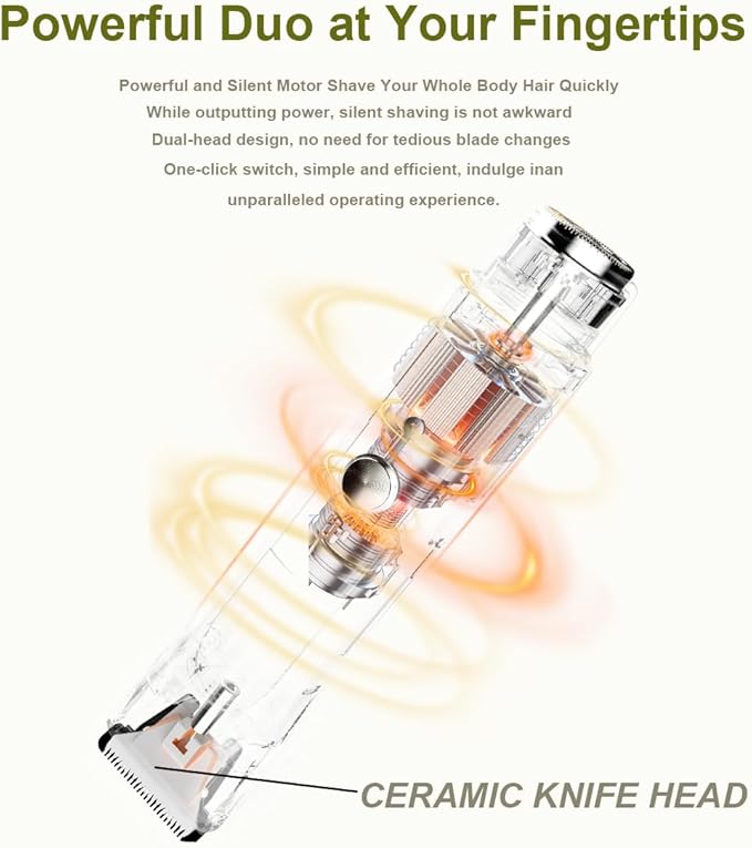 - 2-in-1 Dual Head Design: The bikini trimmer for women features two efficient shaving heads capable of removing hairs on various parts of the body. One head is a body shaver, perfect for arms, legs, bikini areas, or other body parts, while the other is a facial shaver head used to remove hairs on the cheeks, chins, and upper lips.