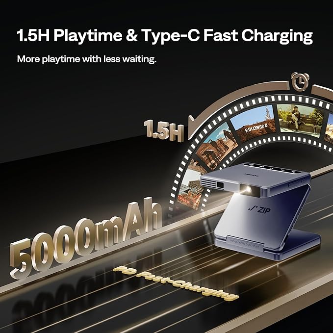 - 1.5-Hour Playtime & PD Fast Charging — With a built-in 5000mAh battery, ZIP travel projrctor delivers up to 1.5 hours of video—ideal for movies, workouts, or stories. Recharge quickly with 24W Type-C PD (adapter required for use while charging)