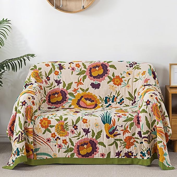 Boho Throw Blanket,100% Cotton Muslin Blankets for Bed,Cozy Fall Throw Blanket,Reversible Bohemian Throw Blankets for Couch,Farmhouse,Golden Phoenix,60"x80"