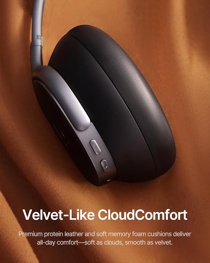 - Velvet-Like CloudComfort: Ergonomic, over-ear Bluetooth headphones wrapped in velvet-like protein leather and padded with soft, resilient memory foam. These wireless headphones offer cloud-like comfort for all-day wear— Whether you're indoors, outdoors, commuting, or on a flight.