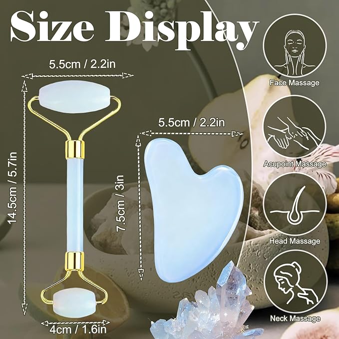 • Made of Jade: This gua sha roller set includes a facial massager and a gua sha tool. Unlike common plastic materials, we use a variety of jades, including rose quartz, opal, and aventurine, which adhere better to the skin and provide comprehensive skincare benefits. The gua sha tool promotes lymphatic drainage, reduces puffiness, and improves blood circulation for a radiant complexion.