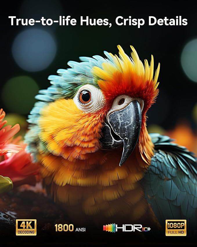 - Theater-Grade Imagery, Crystal-Clear Detail: This outdoor projector delivers cinematic clarity and vibrant visuals with native 1080P 4K video support and 1800 ANSI. Not just for nighttime, enjoy stunningly clear images even in ambient light. Every frame bursts with vibrant colors and crisp details, thanks to HDR10+ and 99% color gamut coverage - these features not only render subtle hues accurately but also reduce blue light exposure. Perfect for both indoor and outdoor use. (Note: Videos labeled as 4K will display at a native resolution of 1080P)