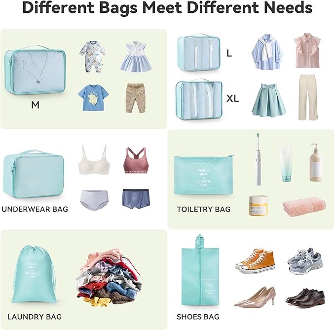 - 3-Piece Luggage Set + 7 Storage Bags for Ultimate Organization: This 3-piece luggage set includes 20", 24", and 28" suitcases, perfect for various travel needs. The set comes with 7 storage bags (laundry bag, shoe bag, lingerie bag, toiletry bag, cosmetic bag, and more) to keep your items organized and neatly packed.
