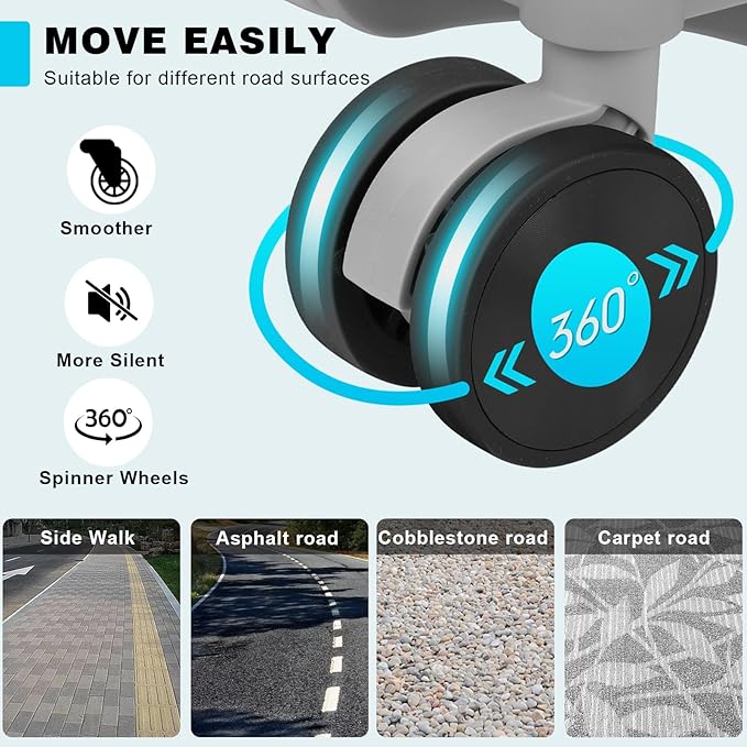 - Dual Spinner Wheels: The zipperless luggage is equipped with 4 dual silent spinner wheels, smooth and easy gliding. In addition, the 360° spinner wheels can be easily rotated in any direction, forward or backward, to ease your burden of movement.