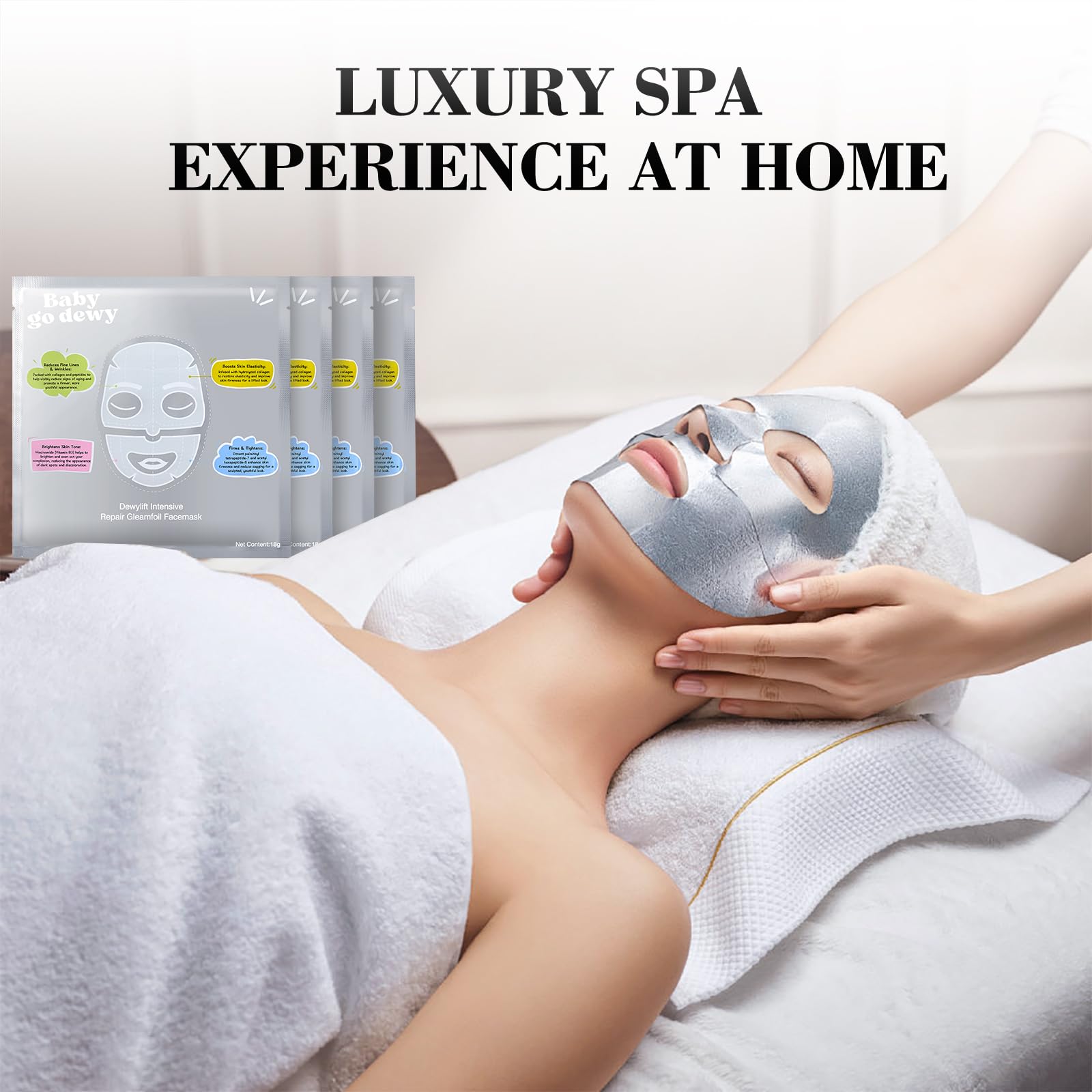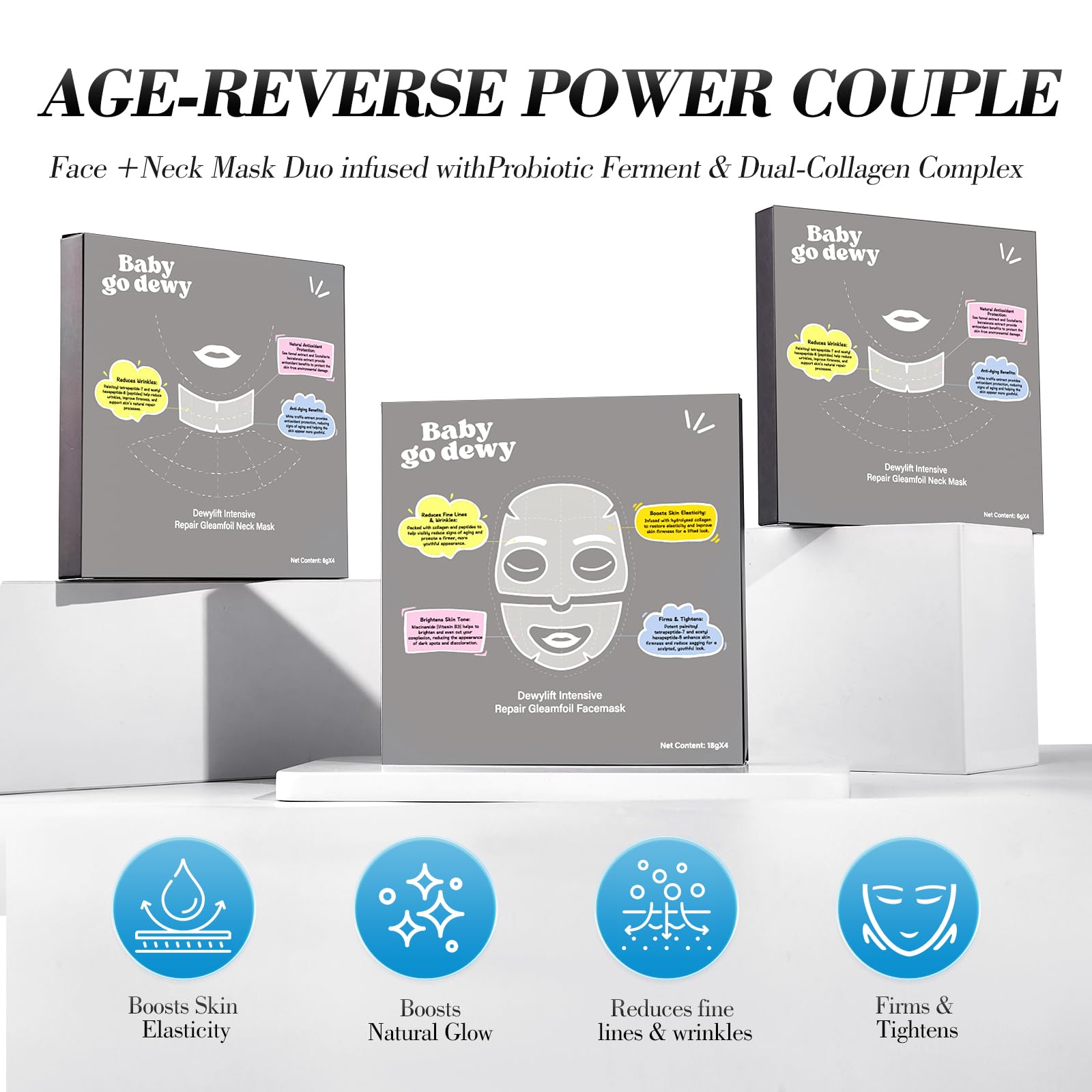 Baby Go Dewy Bio-Collagen‑Peptide Face Mask Sheets – Gleam Foil Intensive Overnight Hydrate Face & Neck Masks for Moisturizing, Firming & Lifting Care – 8 Count(4 Face Masks + 4 Neck Masks)
