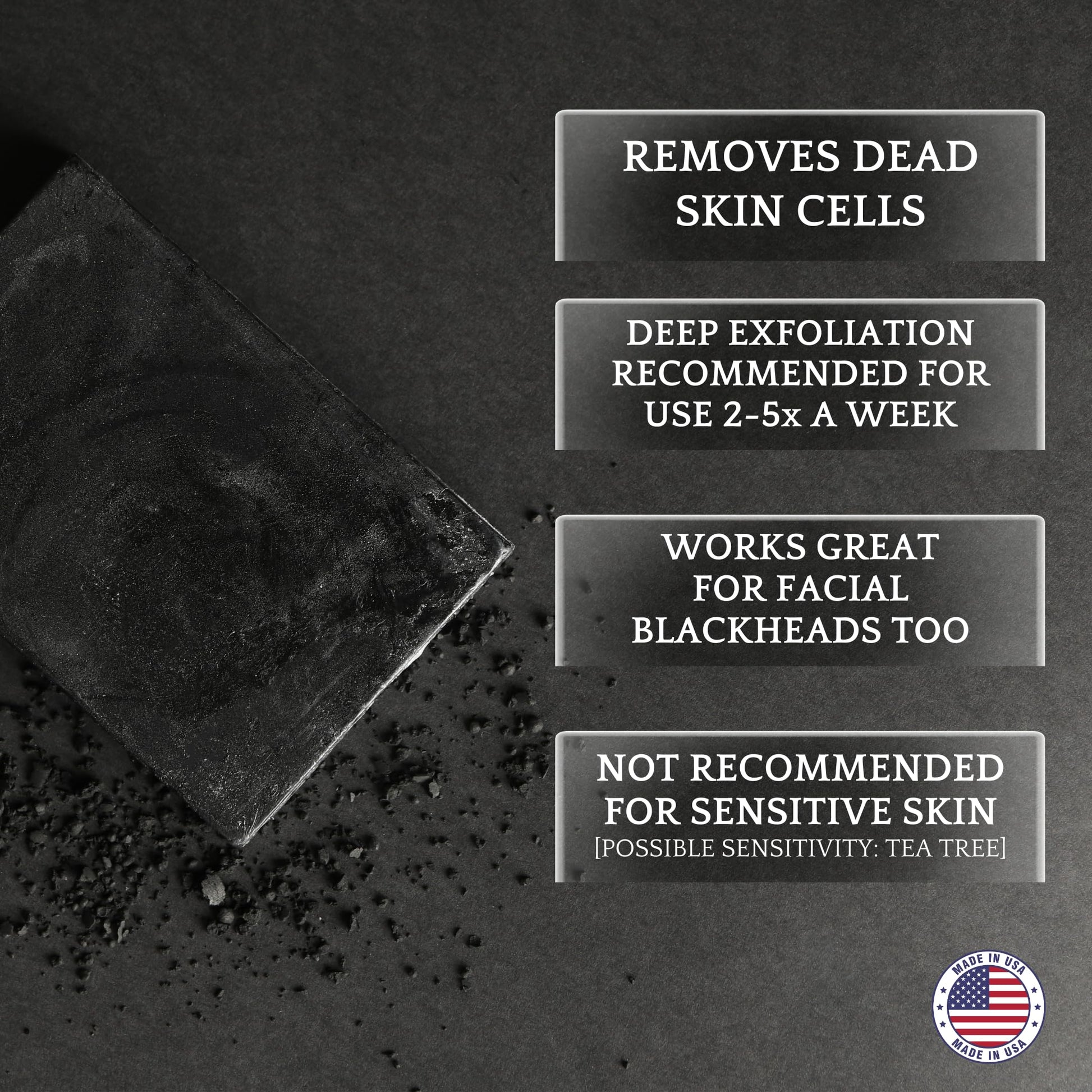 - Activated Charcoal: Infused with activated charcoal, our soap deeply cleanses pores, drawing out impurities, excess oil, and toxins, helping to banish acne-causing bacteria. This is a heavily concentrated bar of charcoal soap so you'll want to moisturize after your shower becuase of the amount of exfoliation you can expect.