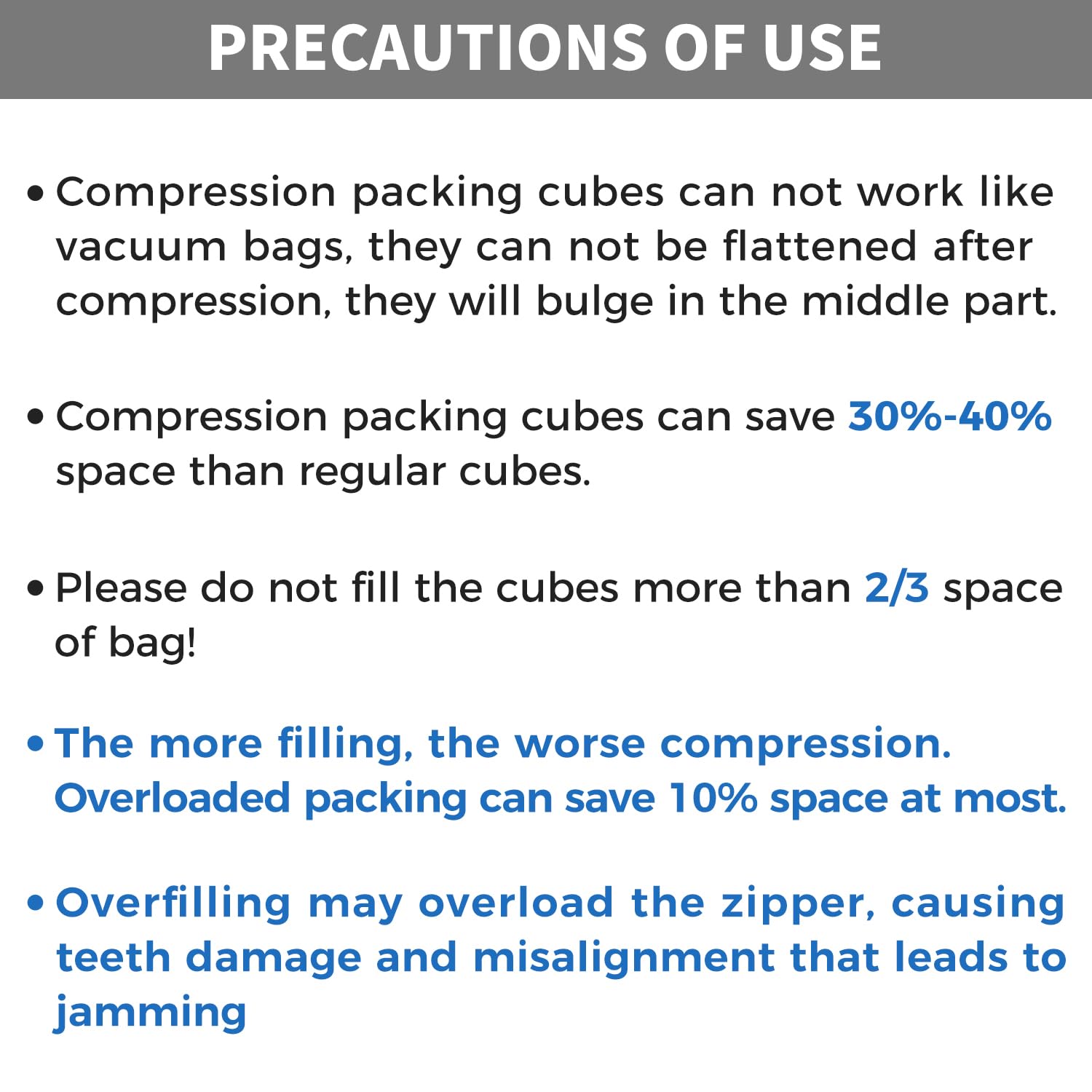 - HOW TO MAKE THE COMPRESSION HAPPEN? - There Is a Extra Zipper Outside Of Our Compression Packing Cubes Which Can Be Zipped Up To Flatten The Cubes And Save The Space As Far As Possible. It Just Works Like a Vacuum Sealer. You Just Need To :1) Fold Your Clothes And Flatten Them 2)Pack Clothes In The Cubes And Zip The Normal Zipper. 3)Put A Finger On The Back Of The Zipper In The Space When Compressing The Packing Cubes In Case The Zipper Get Stuck In Fabric.