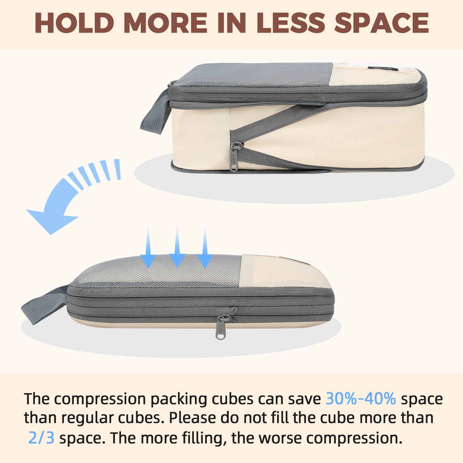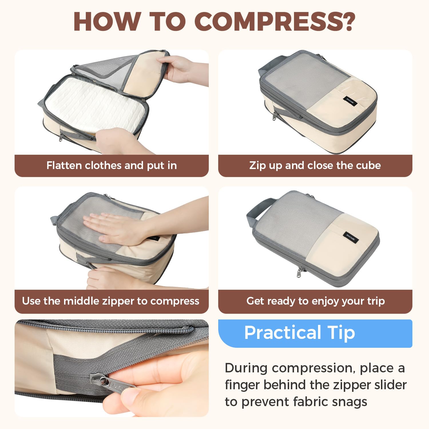BAGAIL 6 Set/4 Set Lightweight Compression Packing Cubes for Travel, Anti-Tearing Expandable Organizer Bags for Suitcase(6 Set, Beige)