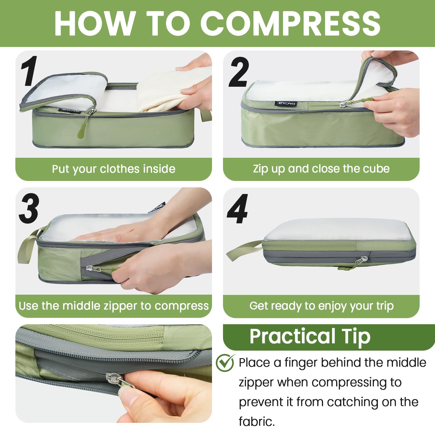- How to Compress:The cube is compressed by the middle zipper; Using steps: 1)Fold and flatten clothes 2)Pack clothes in the cube and zip the front zipper 3) Put a finger on the back of the middle zipper when compressing to avoid zipper get stuck in fabric