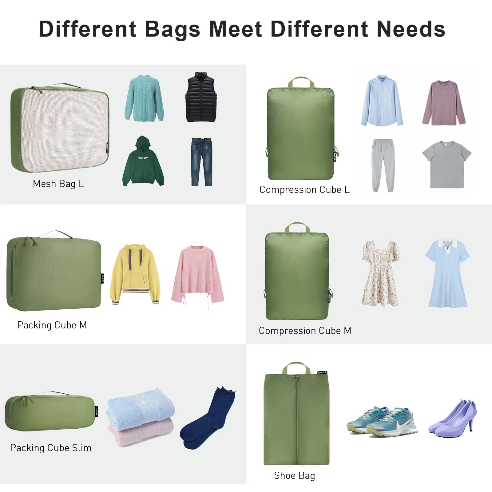 - Well Organized: We offer 3 regular and 3 compression packing cubes with 1 shoe bag to meet your different packing needs; Classifying and organizing your belongings for your travel will become easy with these ultralihgt packing organizers