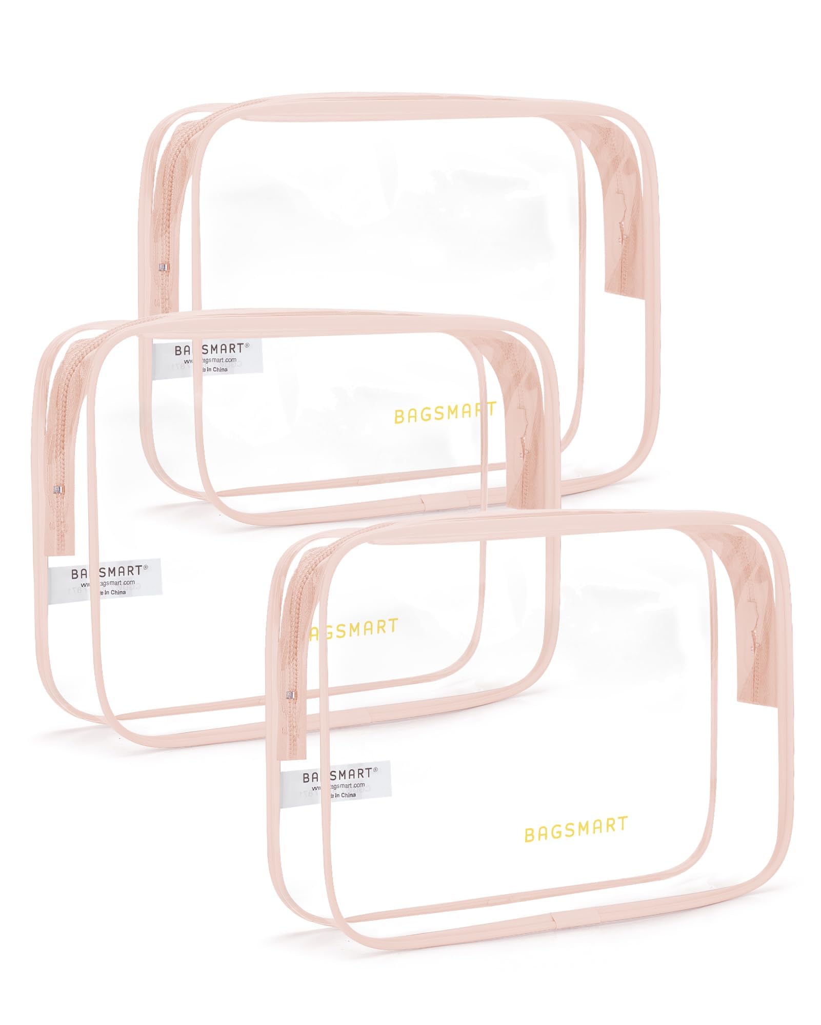BAGSMART Clear Toiletry Bag, 3 Pack TSA Approved Travel Toiletry bag Carry on Travel Accessories Bag Airport Airline Quart Size Bags Water Repellent Makeup Cosmetic Bag for Women (Nude Pink-3pcs)