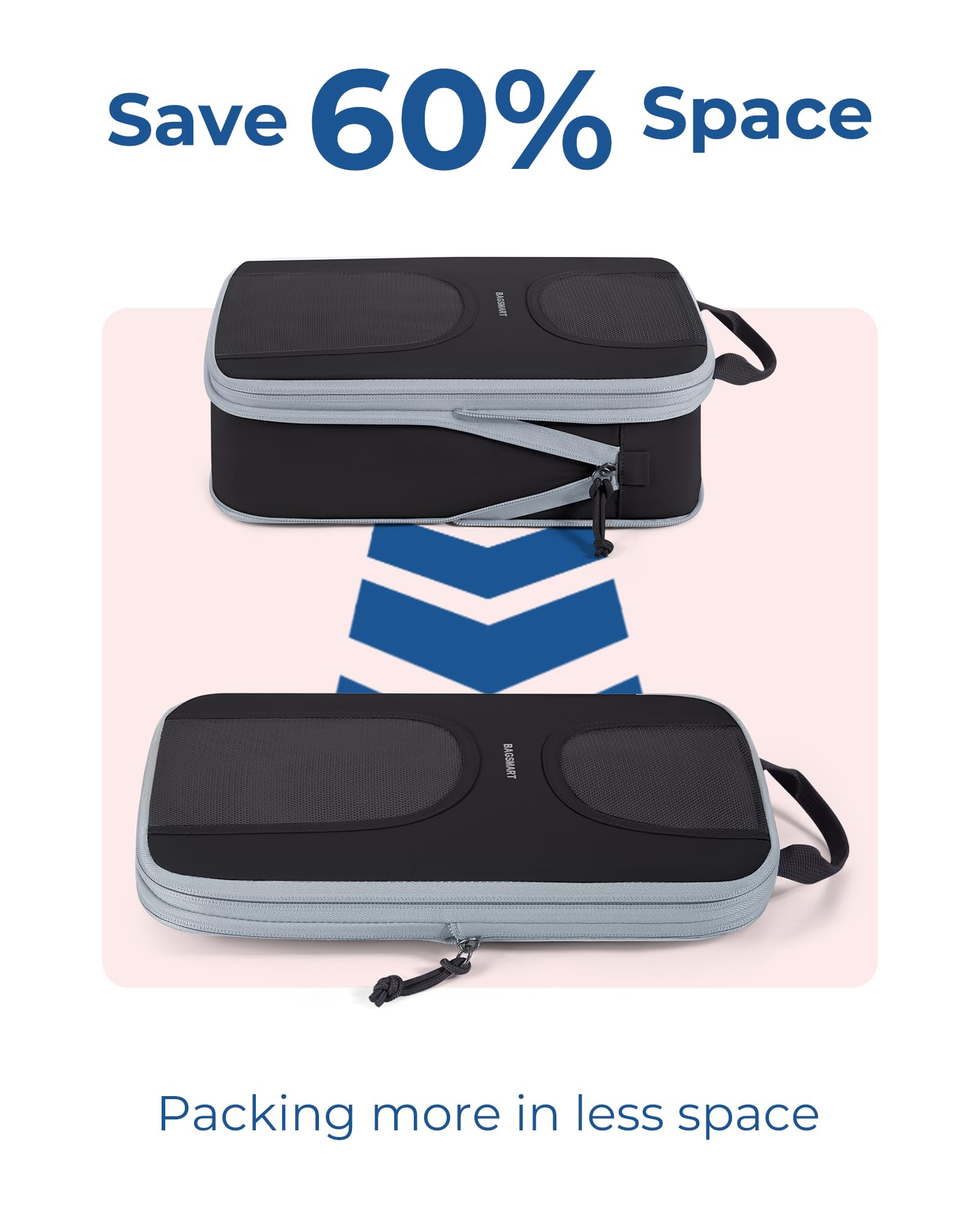 - SAVE 60% SPACE: Just like how a vacuum sealer works. With our compression travel cubes, you can easily compress clothing and other essentials into a compact shape, freeing up to 60% of luggage space. Imagine being able to hold twice as much stuff in your luggage without compromising on style or comfort. Whether you're planning a weekend getaway or a trip around the world, our storage bags are a must-have solution for savvy travelers like you.