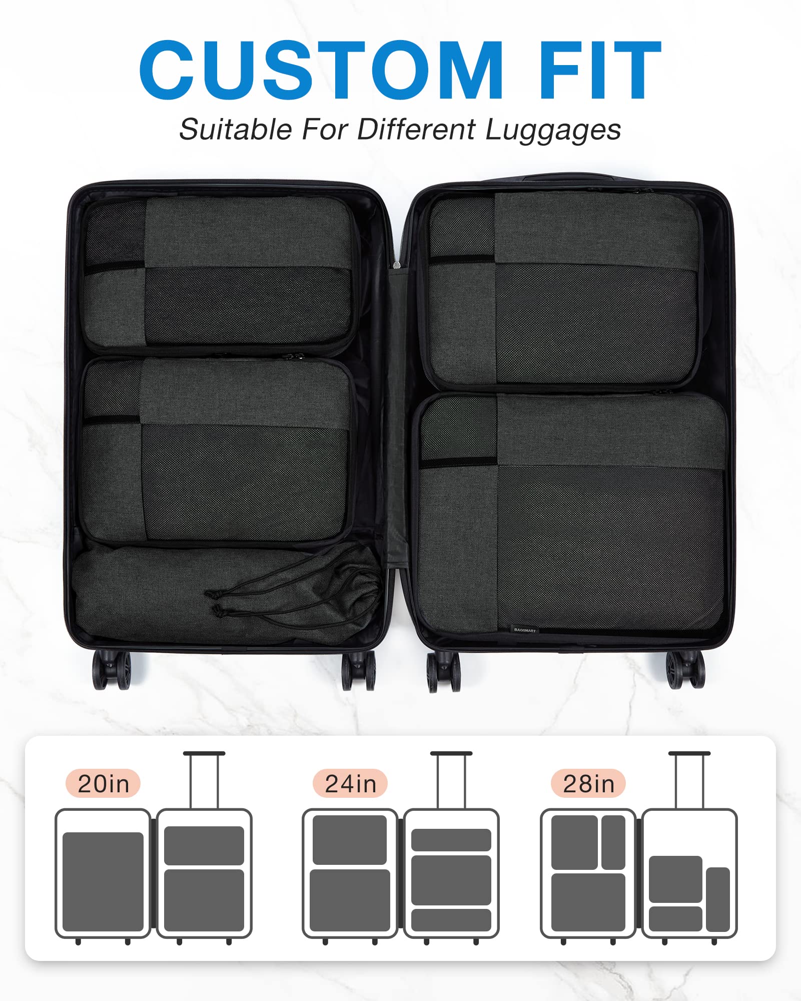 - WHAT WE LIKE: Some of us travel with capsule wardrobes and others pack multiple outfit options for everyday of the week. If your packing style is more in line with the latter, you no longer need to sacrifice style for space. These packing cubes compress more garments into one bag so you can minimize your luggage size without ditching that extra pair of shoes. The set of six includes five cubes in sizes small, medium, and large, and a bonus shoe bag for organizing your footwear.