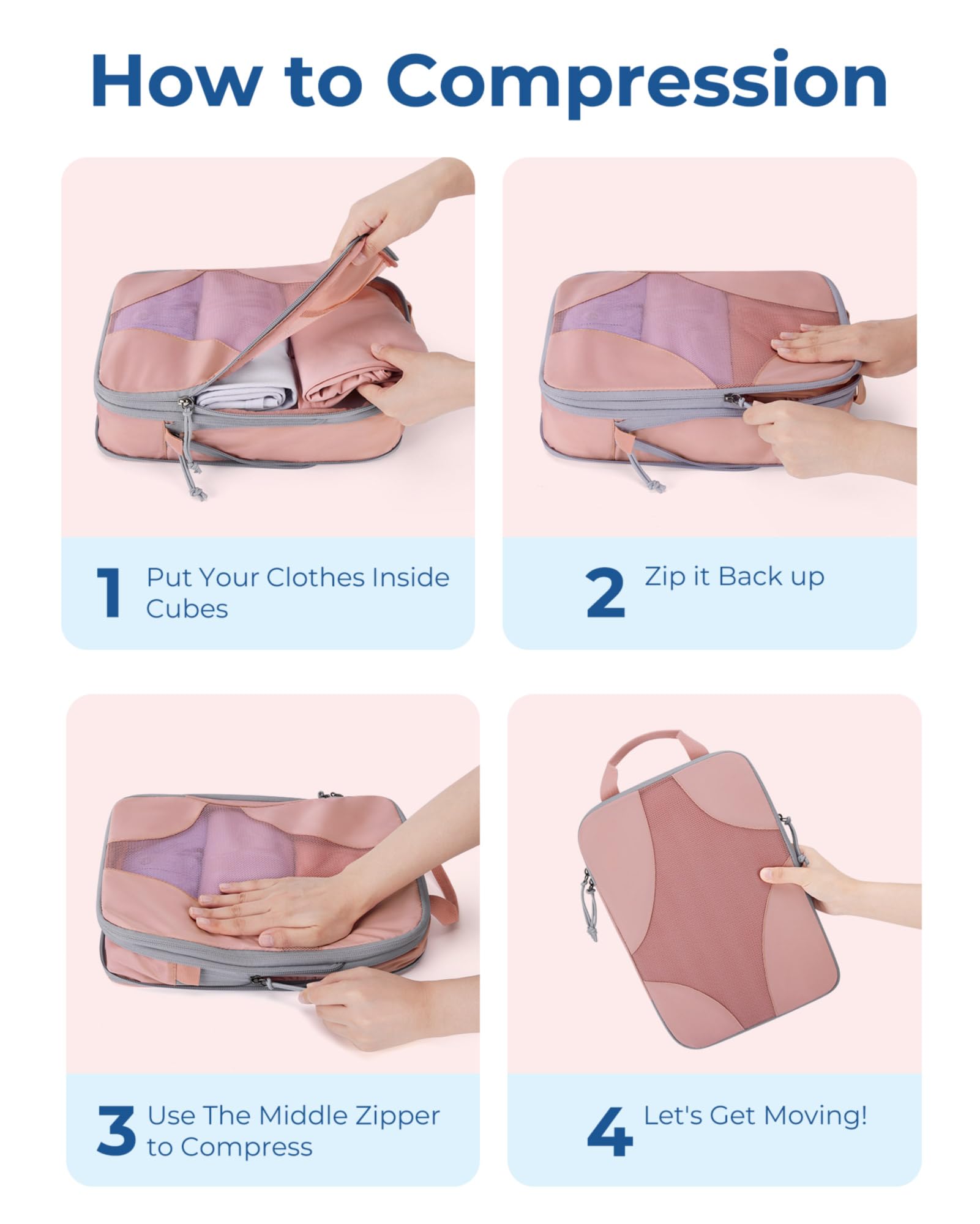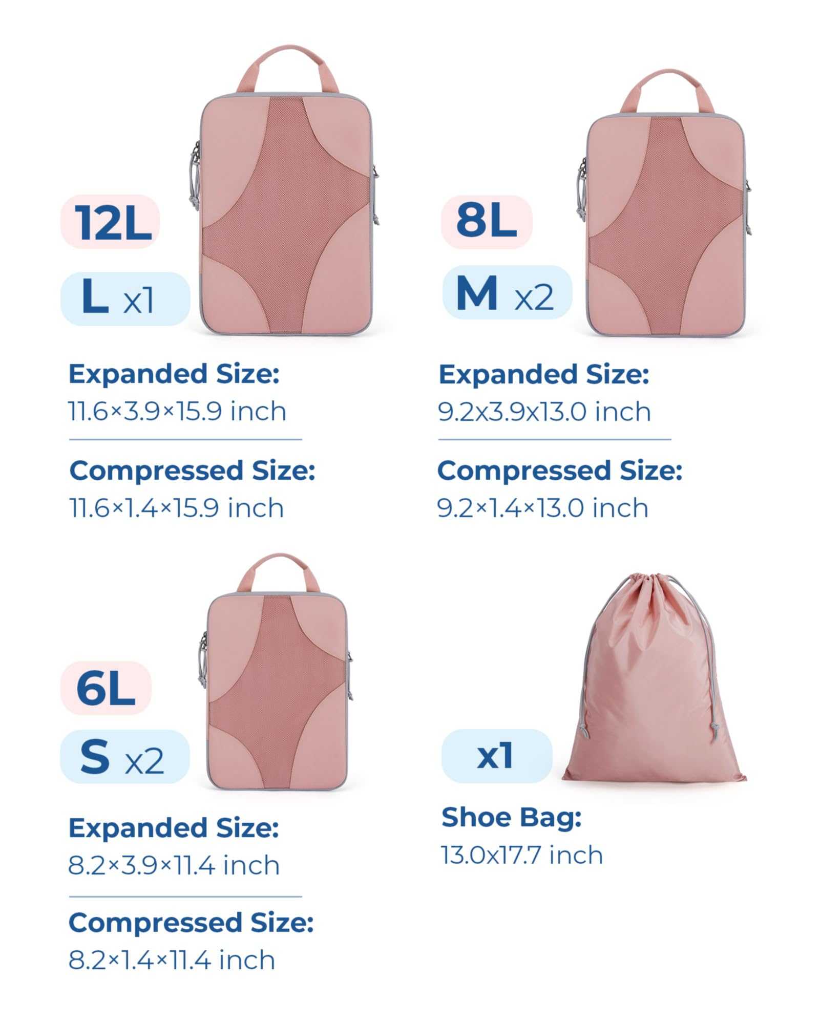 BAGSMART Compression Packing Cubes for Travel, Compressible Luggage Organizer for Carry On Suitcase, Lightweight Travel Essentials 6-Pack 1L+2M+2S+1Shoe Bag,Clay Pink