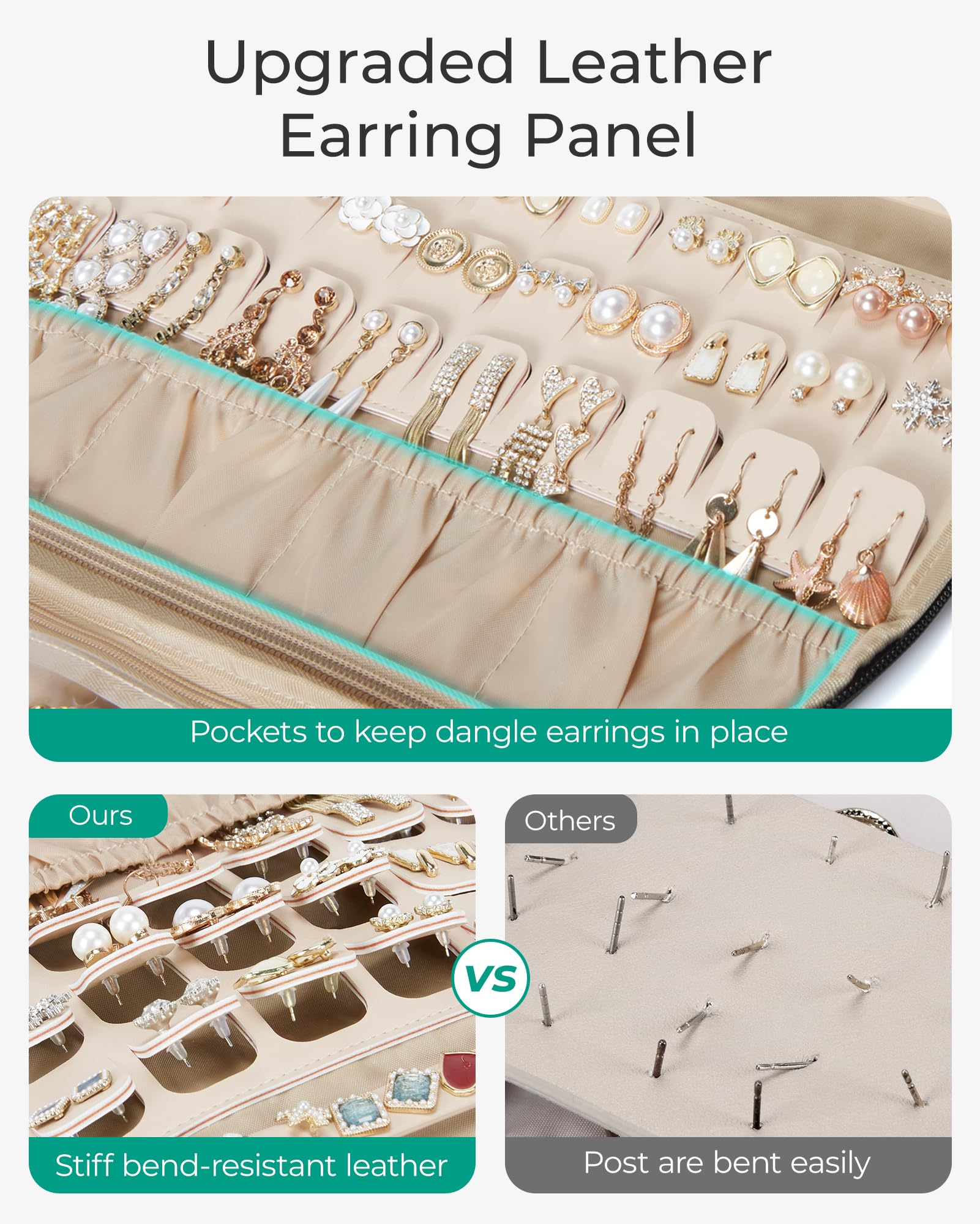 - Large Capacity: Measuring 12.40 × 9.06 × 0.79 inches, the travel jewelry case has the following features: 8 tangle-free necklace holders; 2 padded bands for earrings or rings; 1 bend-resistant leather board that can hold 30 pairs of earrings, with pockets designed to keep dangle earrings in place; 6 medium-sized pockets suitable for bracelets and hair clips; and 5 large pockets for large jewelry pieces. It can efficiently store a variety of jewelry items