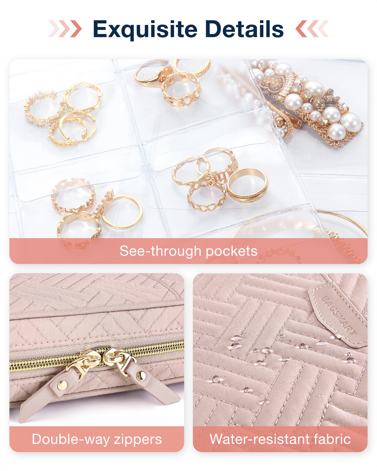BAGSMART Large Jewelry Travel Organizer Case for Home Jewelry Organizer Storage Ring Binder Jewelry Bags Clear Jewelry Rolls Zipper Pouch Bag for Necklaces, Earrings, Rings, Bracelets, Pink
