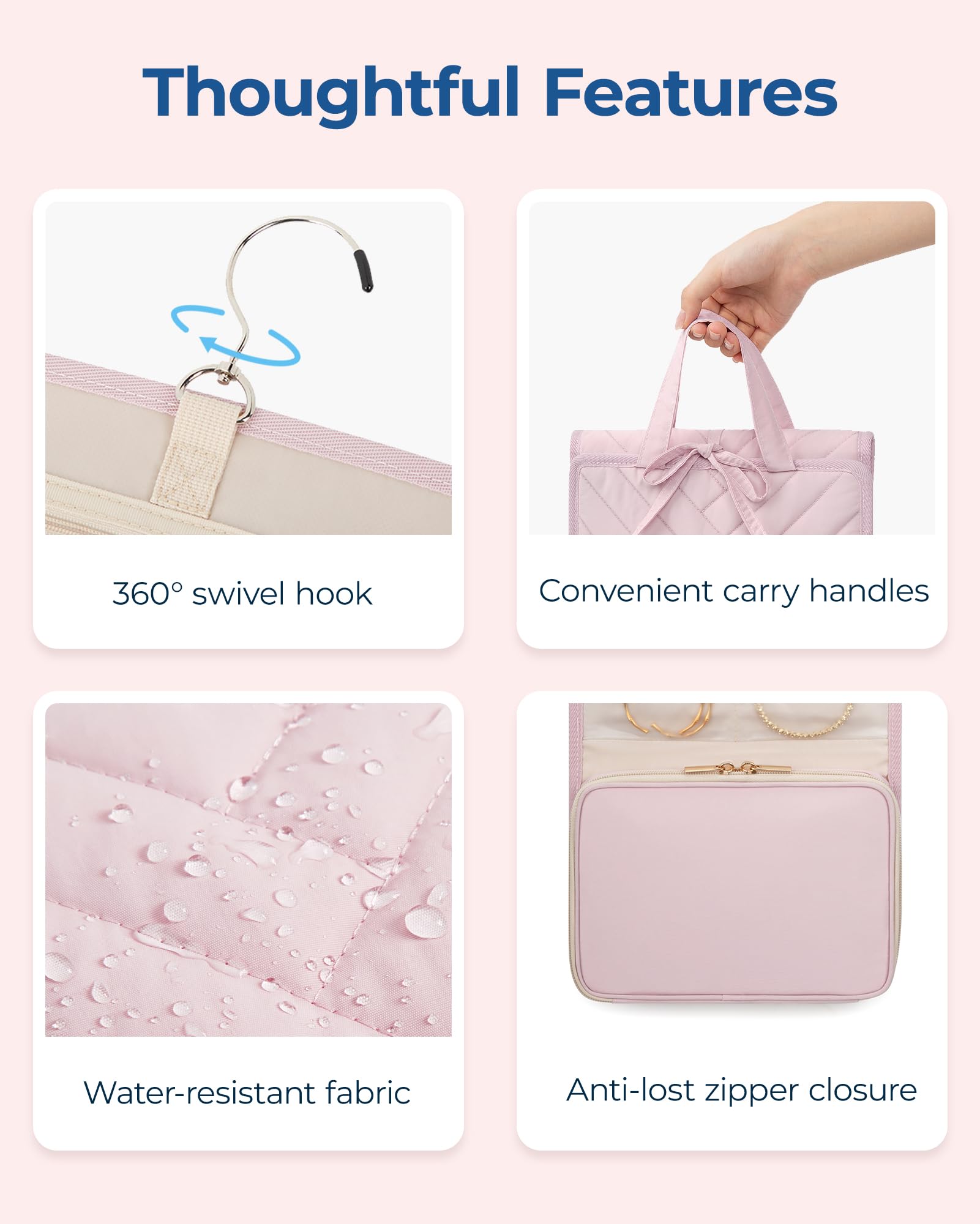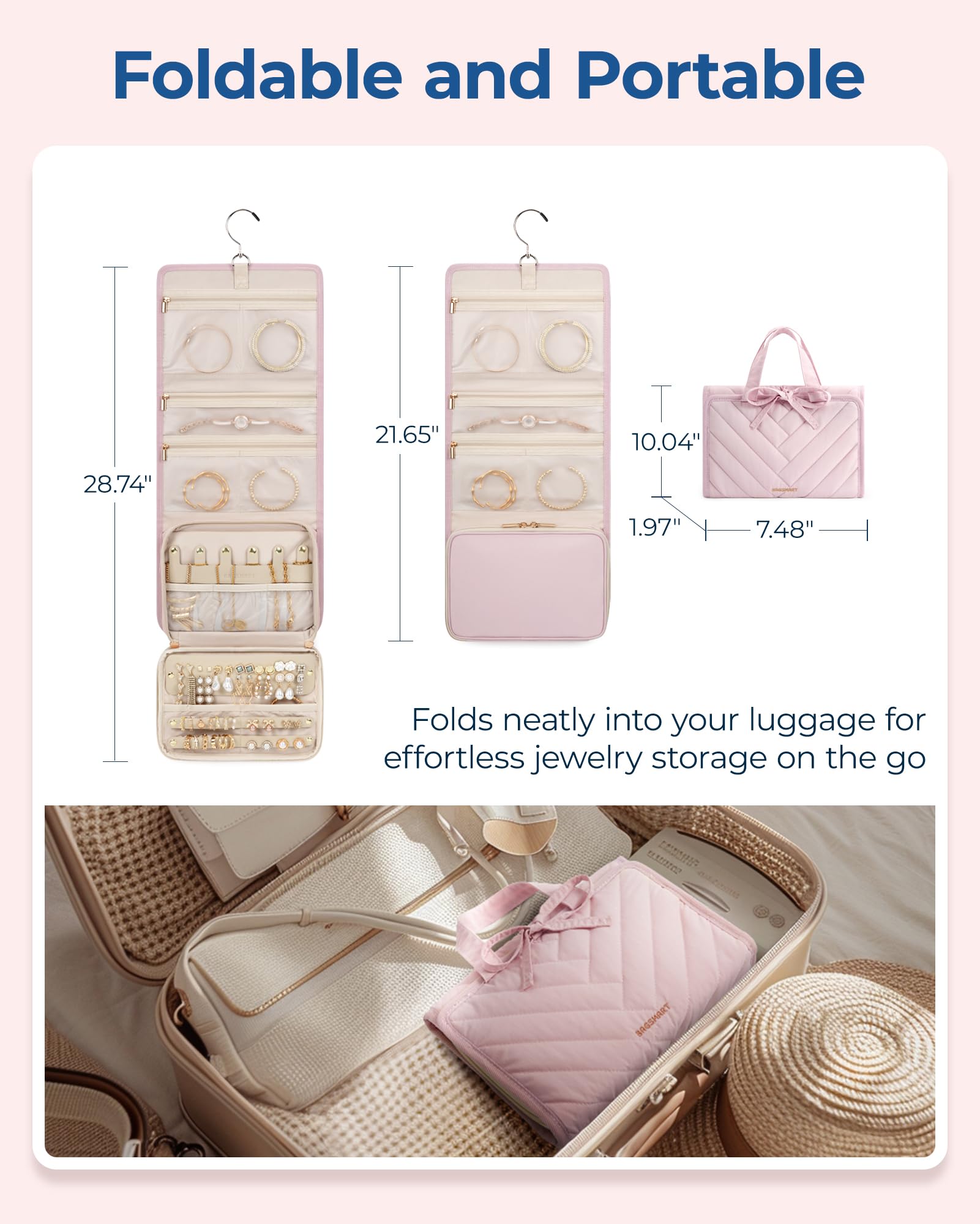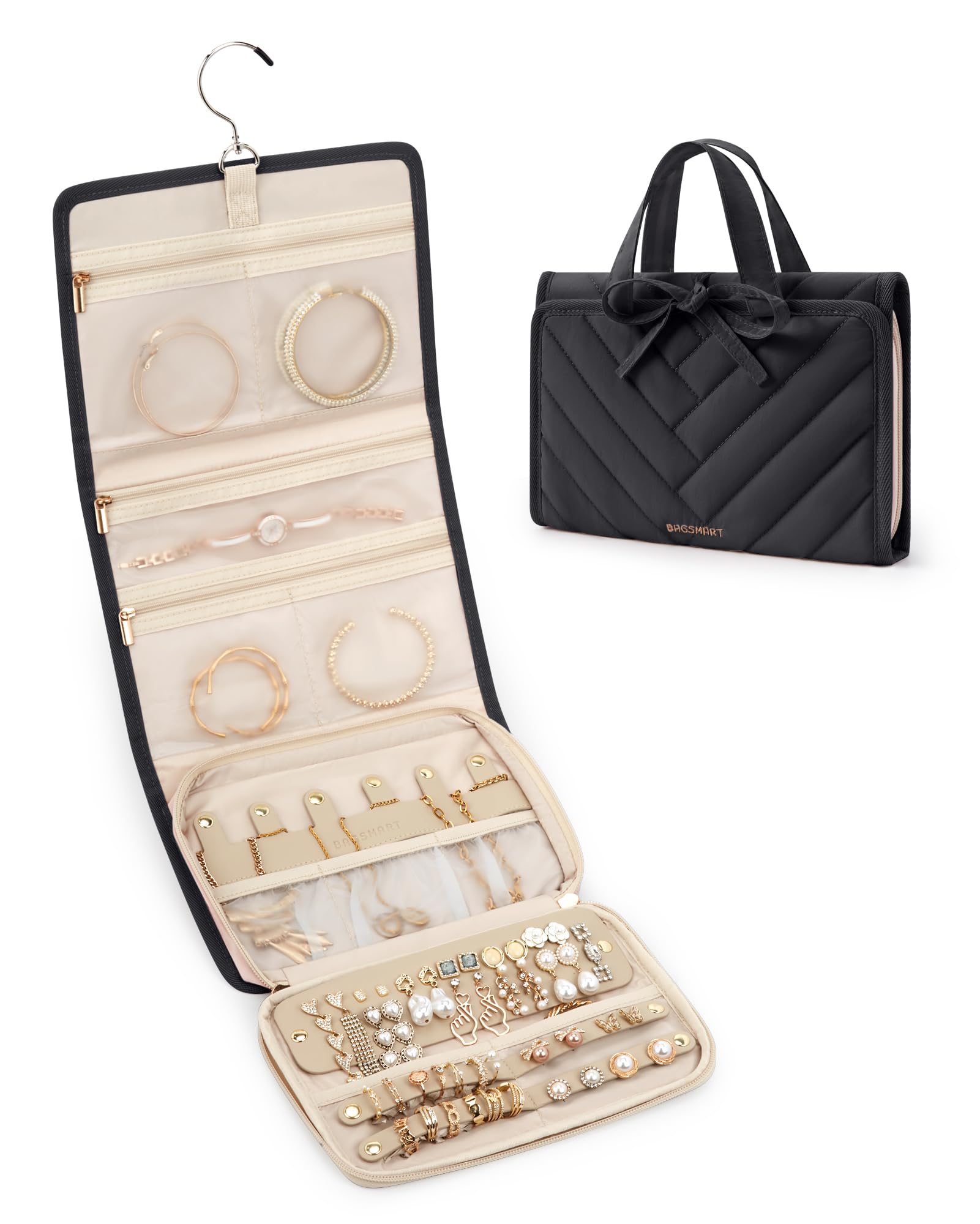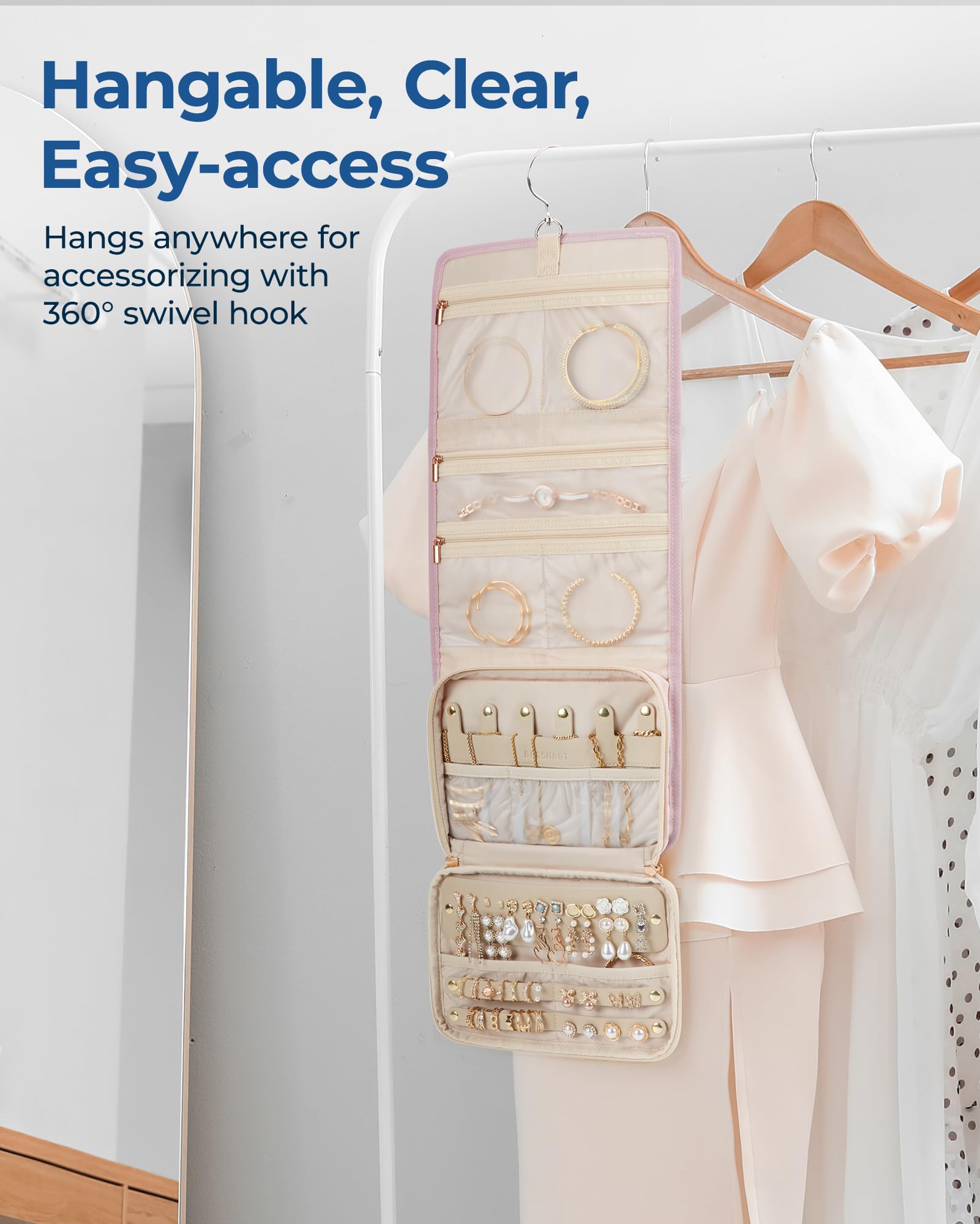 - 【Travel Convenience】: This jewelry organizer folds neatly to a compact size of 7.48 x 1.97 x 10.04 inches. It boasts features like a 360° rotating hook, sturdy dual handles, and splash-resistant fabric to ensure the security of your items, perfect for packing into any bag or suitcase for effortless travel to any destination.